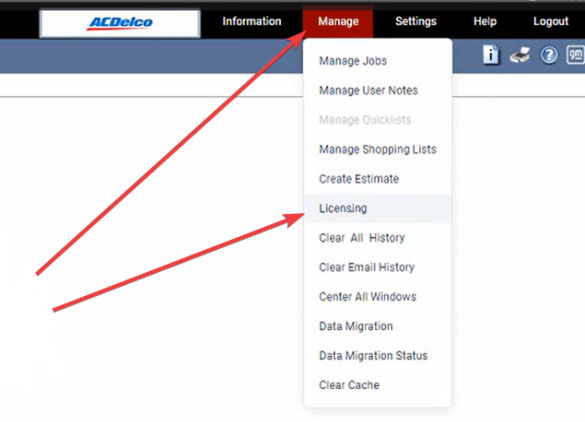 (Reference image shows the Manage menu expanded with the Licensing option highlighted.)