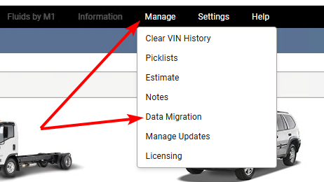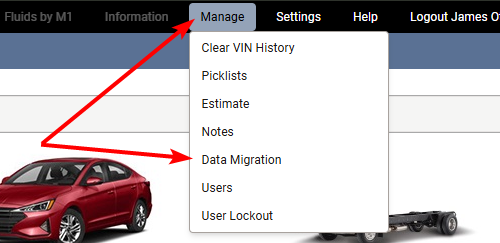 - In the Web Catalog (www.snaponepc.com), go to the Manage menu and select Data Migration.