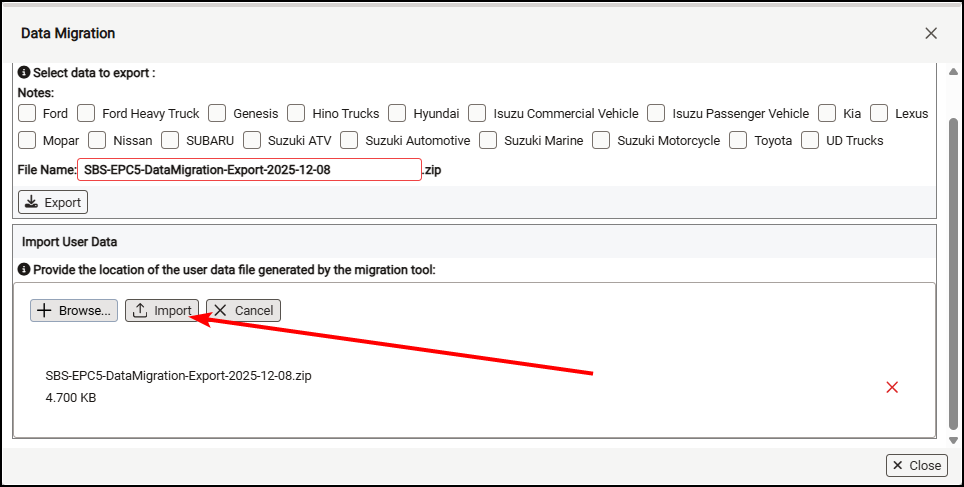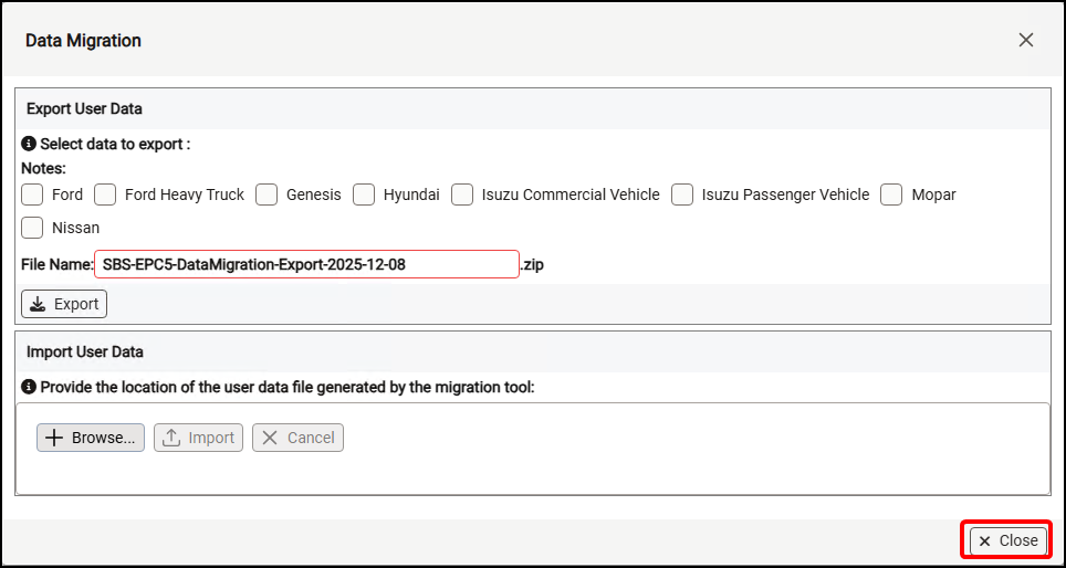 - In the Data Migration window, under Export User Data, check all datasets, then click Export.