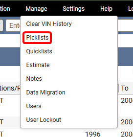 At the top of the screen, click Manage then select Picklists.