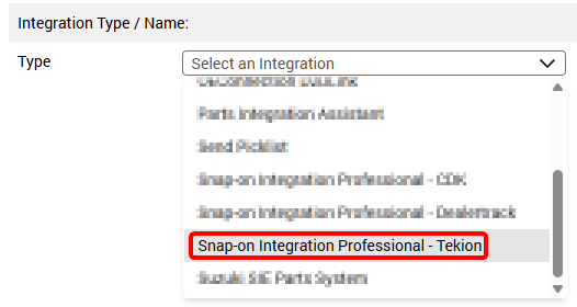 From the Select an integration dropdown, choose Snap-on Integration Professional - Tekion.